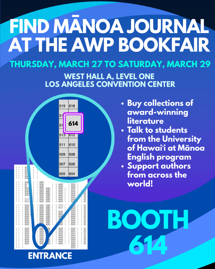 Mānoa Journal will be at AWP 2025 in the Los Angeles Convention Center! Featuring thousands of literary professionals and hundreds of events celebrating the act of writing, the AWP Conference and Bookfair is one of the largest writing events in the world. Mānoa Journal will be present both at the bookfair and hosting special events throughout on our latest two releases and our upcoming issue, Architectures of FuturoPasados.