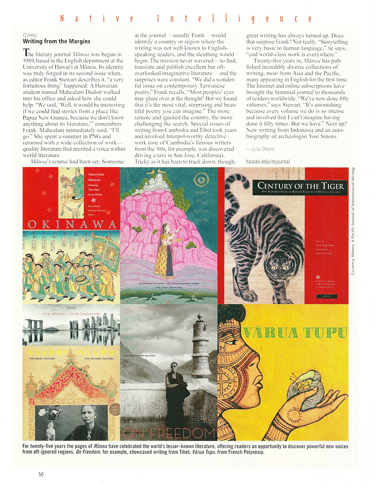 “Mānoa is a journal that’s much more than a magazine: every issue is an exuberantly oversized paperback slab of a book, packed with dazzlingly illuminative writings. Editors Frank Stewart and Pat Matsueda succeed brilliantly in providing curated insights, with the astute assistance of local guest editors and skilled translators, into non-Western (mostly Asian/Pacific) literature—and a welcome cultural antidote to the tropes of more familiar English-language publishing.…